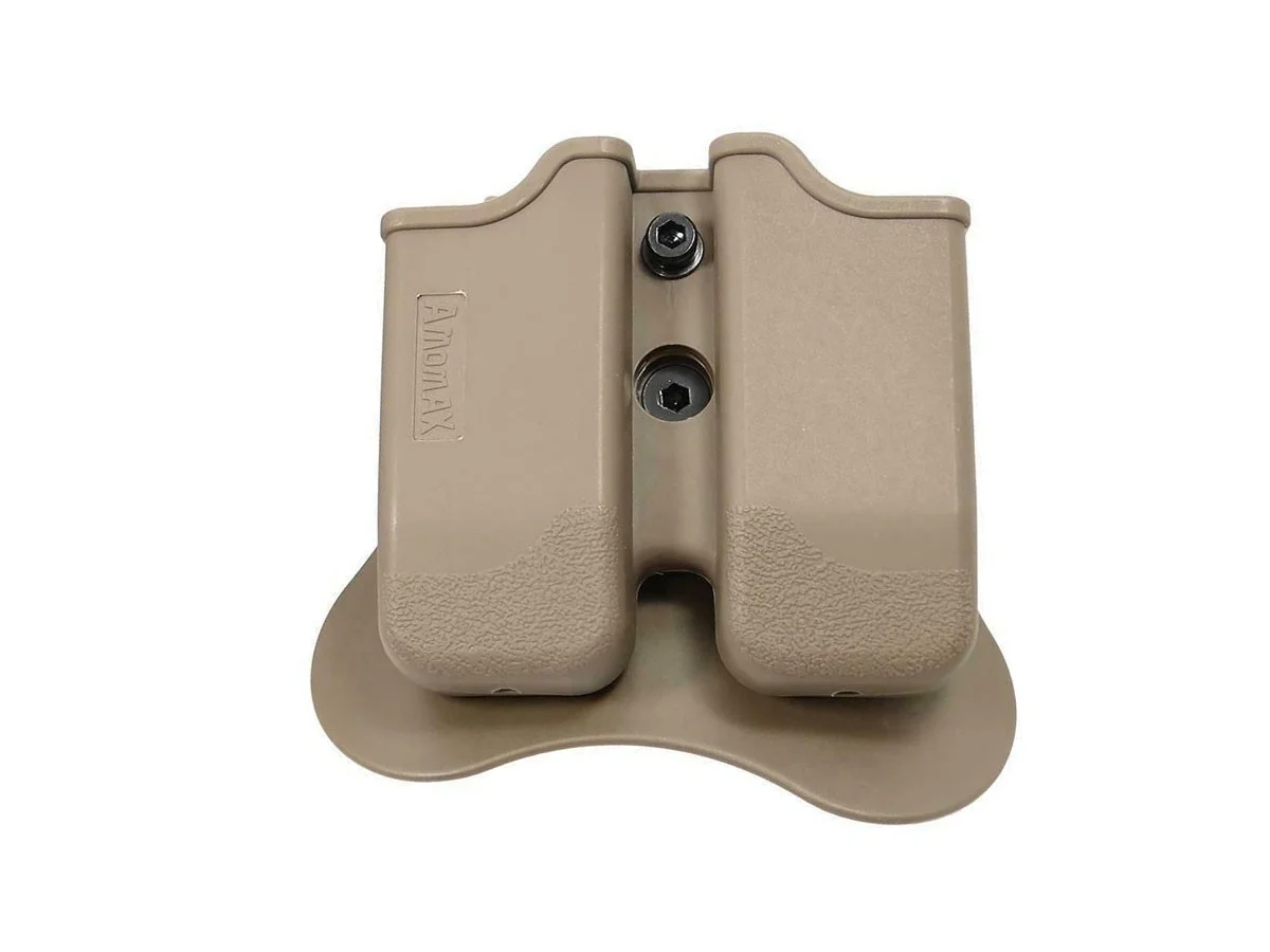 Acest suport rigid de la Amomax este compatibil replici pistol airsoft realizate dupa platforma GLK G17/G19/G18. Este fabricat din plastic si este conceput pentru a fi atasat unei centuri. Suporturile incarcatoarelor pot fi modificate rotativ pentru a fi usor accesibile utilizatorului. Avantajul acestor suporti este fixarea mult mai ferma a incarcatoarelor.