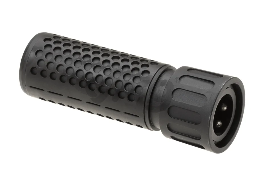 Amortizor fabricatie Ares din aluminiu cu diametru de 38mm. Fiind fabricat din aluminiu greutatea lui este redusa astfel imbunatatind manevrabilitatea. Amortizorul reuseste sa atenueze o parte din sunetul produs de bila ce paraseste teava interna a replicii. Lungimea este de 125mm.Diametrul acestuia este de 38mm.