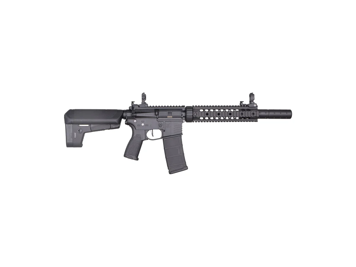 Exteriorul replicii AR15 SilentOps 9” BRAVO este realizat din metal si polimer ramforsat cu fibra de sticla. Aceasta replica dispune de siste de schimbare rapid al arcului QRS Gen.II si sistem de schimbare rapid al motorului datorita manerului tip B5.